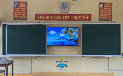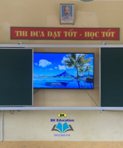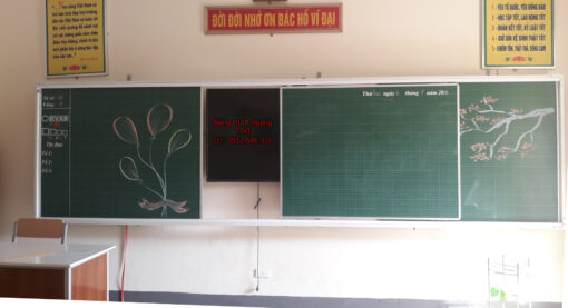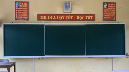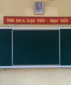-Khung bảng: Làm bằng thép hộp 25×50 sơn tĩnh điện màu trắng sứ. Trên 2 thanh ngang có gắn ray nhôm để bánh xe trượt khi đẩy tấm bảng giữa di động.